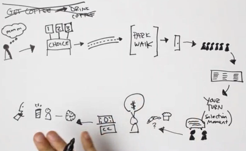 To create a great user experience, walk in your user’s shoes. A user persona encourages your team to say, “I’m going to log in as Andrew the Administrator and try to complete this task his way.” To help your team in this endeavor, map the user’s journey. A journey map help us understand the user’s experience for a single process or a very complex one. For example, Figure 2 shows the process for purchasing a cup of coffee (Journey, 2013), starting with where to get the coffee and ending with the first sip.