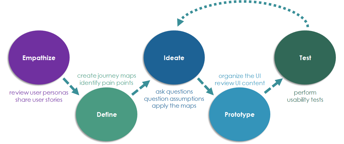 Figure 3 is based on the design process model created by Effective UI. At the Empathize stage, you create or update user profiles and personas, share stories about those users, and encourage your team to think like those users. The Ideate stage allows the team to plan methods for satisfying customer’s needs and resolving pain points. This is where you apply what you learned from the journey maps. If you have multiple solutions, perform quick usability tests to see which might be the best course. During the Prototype stage, you can review the user interface and organization of the user activities. Finally, in the Test stage, perform the DIY usability tests.